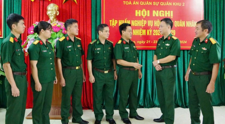 Đại tá Khổng Đình Tám, Chủ nhiệm Chính trị Quân khu trao đổi kinh nghiệm với cán bộ tham gia tập huấn Hội thẩm Quân nhân.
